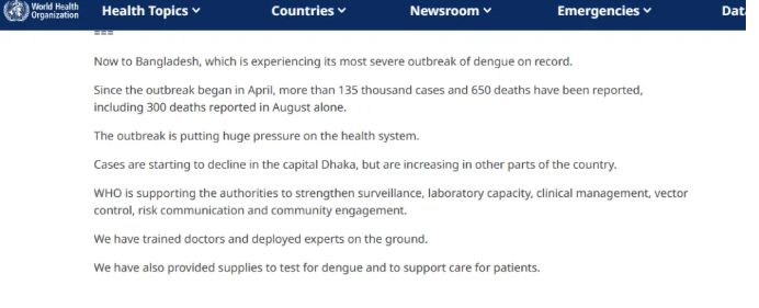 世衛(wèi)組織總干事譚德塞周三在新聞發(fā)布會上表示,僅上個月就有超過300人死于登革熱,疫情的爆發(fā)給孟加拉的衛(wèi)生系統(tǒng)帶來了巨大壓力。