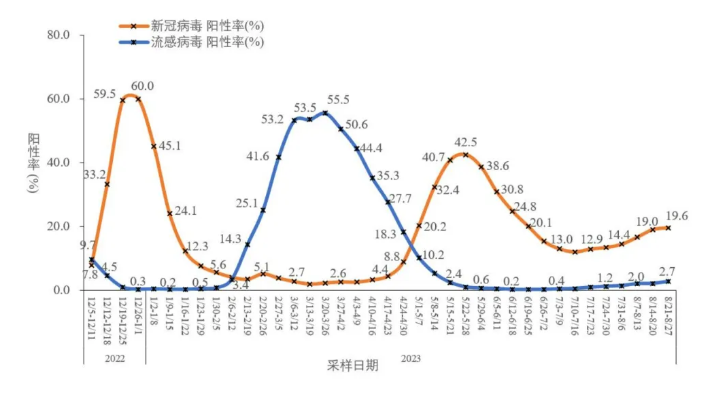 中疾控日前發(fā)布2023年8月全國(guó)新型冠狀病毒感染疫情情況顯示,全國(guó)哨點(diǎn)醫(yī)院流感樣病例新冠病毒陽(yáng)性率從第31周(7月31日-8月6日)的14.4%緩慢上升至第34周(8月21日-8月27日)的19.6%。